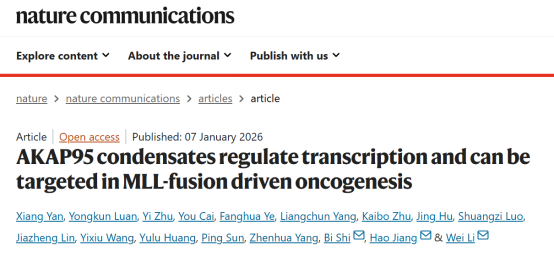 2026年1月7日湖南大学生物学院李薇教授团队在Nature Communications杂志发表论文“AKAP95 condensates regulate transcription and can be targeted in MLL-fusion driven oncogenesis”揭示了RNA结合蛋白AKAP95利用相分离的组织形式招募Pol II和MLL1,偏向性驱动MLL-AF9靶基因的转录,调控MLL白血病的发生和维持。并且,研究人员还采用靶向嵌合体技术构建了一种多肽分子,特异性“化解”AKAP95形成的凝聚体,抑制了MLL白血病细胞的生长,为MLL白血病治疗提供了新的工具。