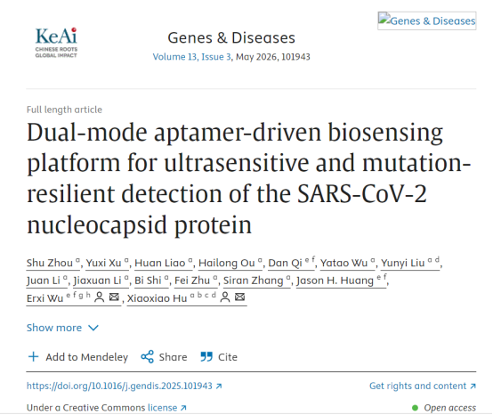 2025年11月19日,湖南大学生物学院胡小晓课题组在重庆医科大学和Elsevier合作出版的生物医学综合性英文科技期刊Genes & Diseases(IF=9.4)上在线发表了题为”Dual-mode aptamer-driven biosensing platform for ultrasensitive and mutation-resilient detection of the SARS-CoV-2 nucleocapsid protein”的研究论文。在该研究中,我们通过计算机辅助的X-aptamer蛋白筛选策略,获得了一种特异性靶向SARS-CoV-2 N蛋白的核酸适体NP14,并从多个方面深入探讨了NP14与SARS-CoV-2 N蛋白的结合机制。通过分子对接、核酸适体的截短分析和碱基突变实验表明,核酸适体NP14与SARS-CoV-2 N蛋白主要通过关键位点核苷酸C24和G27相互作用。