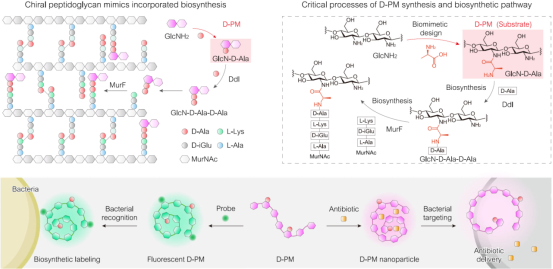 徐翔晖教授团队立足于原核病原菌与真核宿主在手性分子构成上的本质差异,聚焦细菌细胞壁特有的肽聚糖结构——该结构由糖链与特异性手性氨基酸组成,是细菌生存不可或缺的关键结构。受生命体系手性基本属性的启发,研究团队提出“手性劫持”细菌代谢通路的创新理念,通过仿生设计与合成手性肽聚糖模拟物,实现对病原菌的精准识别与靶向干预。研究发现,D型手性肽聚糖模拟物可被细菌生物合成系统主动识别为底物,并被D-丙氨酸连接酶(Ddl)和UDP-N-乙酰胞壁酰五肽合成酶(MurF)有效识别并整合进入肽聚糖生物合成通路,参与细胞壁构建过程。分子动力学模拟结合实验验证表明,D型手性模拟物可直接参与细胞壁合成的下游过程,并在细菌分裂过程中随细胞壁更新持续积累,实现稳定标记与持续干预。在生物医学应用方面,D型手性肽聚糖模拟物展现出广谱、高效的病原菌识别能力,覆盖ESKAPE病原菌、耐甲氧西林金黄色葡萄球菌(MRSA)及临床分离菌株,而对哺乳动物细胞几乎无明显相互作用。基于其对细菌的高度特异性识别能力,团队构建了病原菌特异性成像探针及靶向抗生素递送系统;在小鼠伤口感染和全身性腹膜炎模型中,负载四环素的D型手性肽聚糖模拟物纳米系统表现出优异的组织渗透性和病原菌清除效率,疗效显著优于游离抗生素,并具有良好的体内安全性和生物相容性。